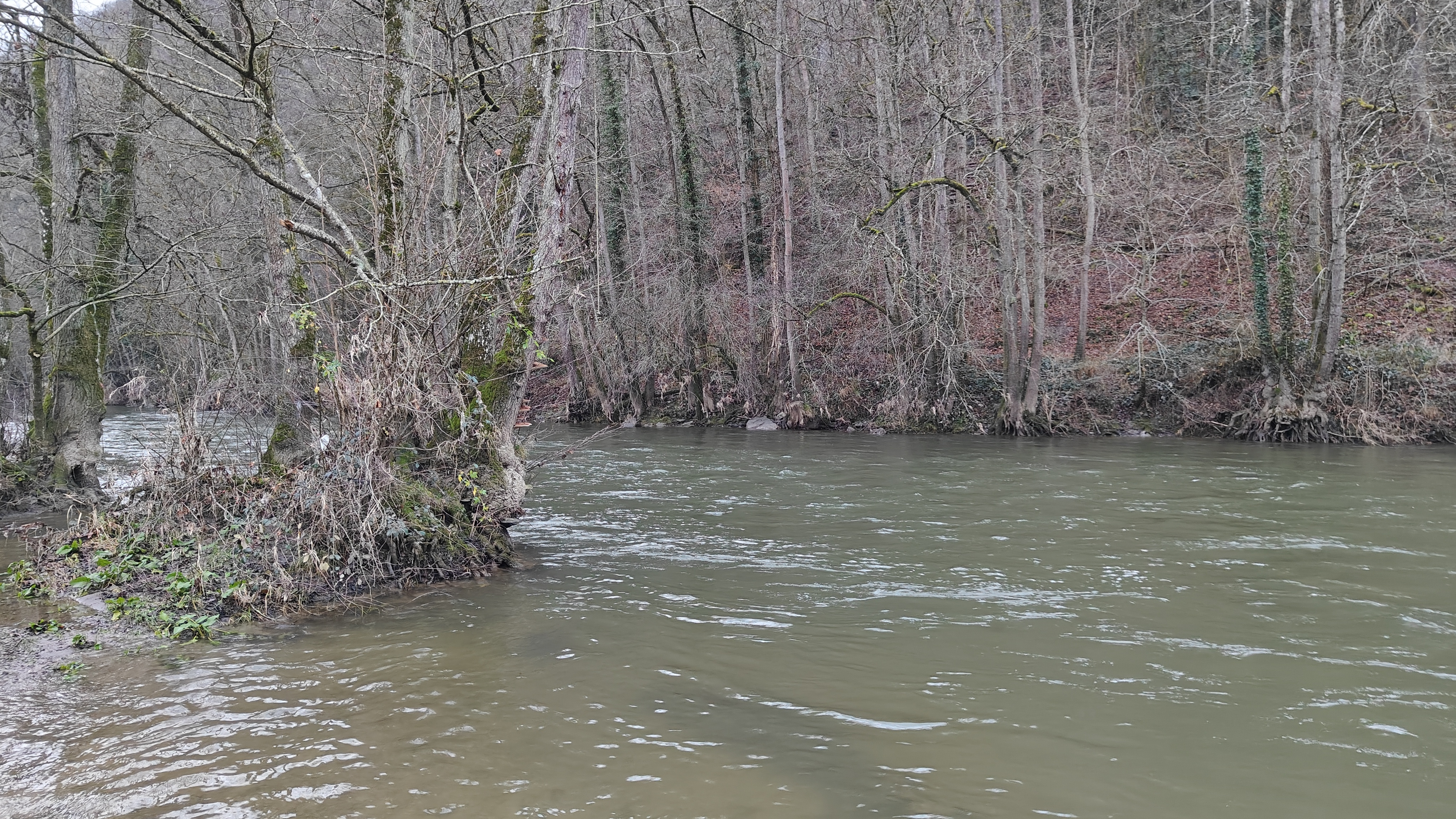 Le lendemain matin, nous nous réveillons avec cette vue sur une Ourthe un peu tumultueuse.